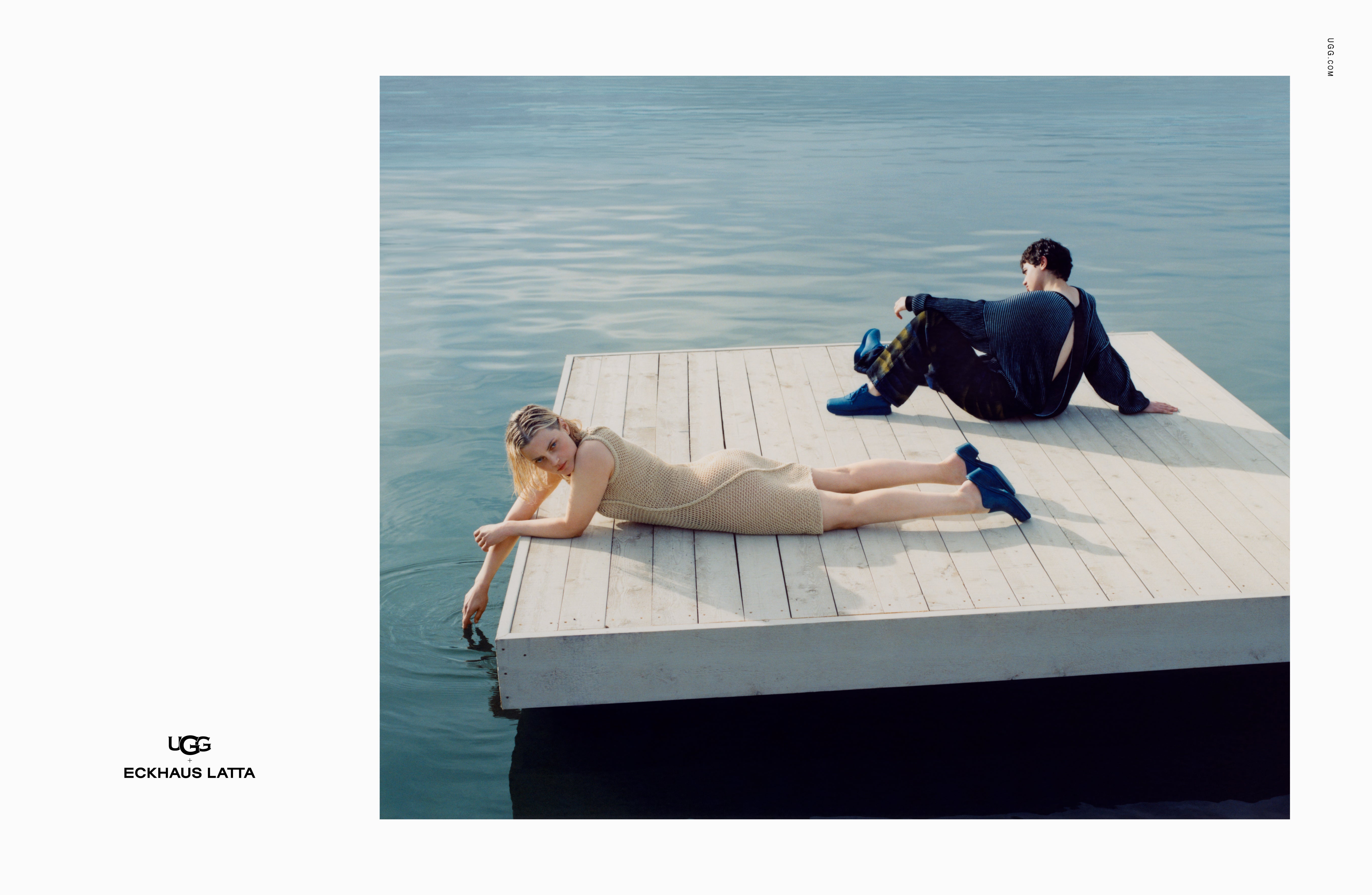 The campaign imagery, shot by fashion and still life photographer Zoe Ghertner, shows models Guinevere van Seenus and Frank Ayzenberg lazing on a floating dock surrounded by water. According to the brands, the minimalistic campaign was inspired by nature.