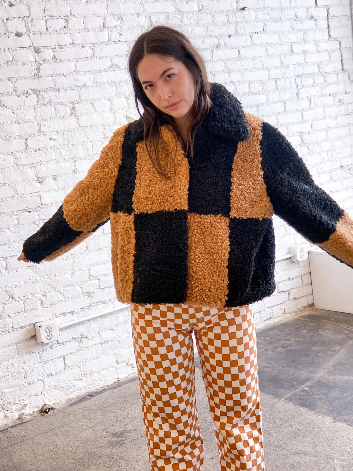 If a full-length, faux fur checkerboard coat is too much of a style commitment for you, the print also comes in more casual fleece and short jacket options.