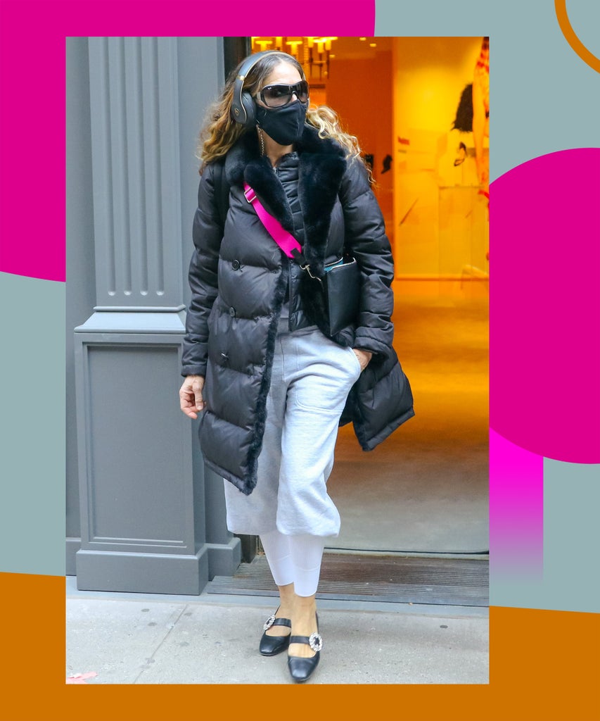 On Tuesday, following the Sex and the City reboot announcement, Sarah Jessica Parker was spotted in her footwear brand SJP by Sarah Jessica Parker’s flagship store in Manhattan. For the occasion, the actress-designer wore a pair of black, kitten heeled Mary-Janes from her brand, which she styled with a gray sweater and capri sweatpants. Given that it’s January in New York, though, she layered what looks like long underwear underneath. And, since it’s Carrie Bradshaw we’re talking about, it actually worked.